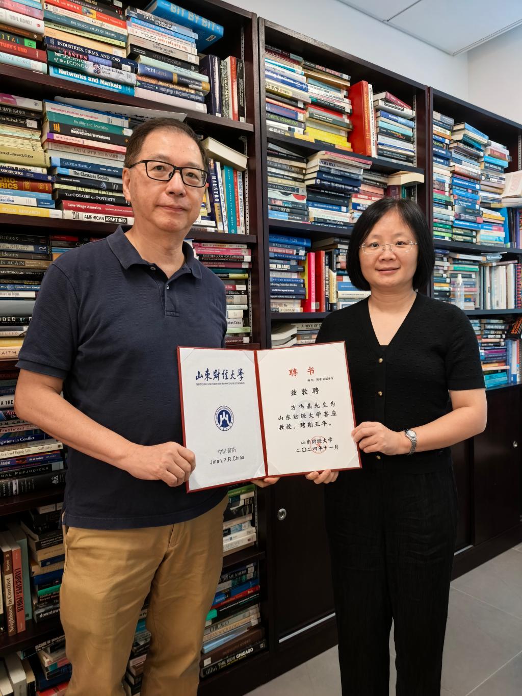 贾海彦与方伟晶进行会谈,转达了校党委书记查玉喜的亲切问候,并为方伟晶颁发了山东财经大学客座教授聘书。双方在国际学术会议举办、课题基金申报、社会调查与数据处理、人才培养等领域达成长期合作意向。与香港大学社会学系青年教师团队进行专题座谈,就社会保险制度与居民福利水平、新市民社会适应研究、家庭追踪调查开展等议题交换经验,并围绕高校学术研究和人才培养的地区差异和合作空间深入讨论。